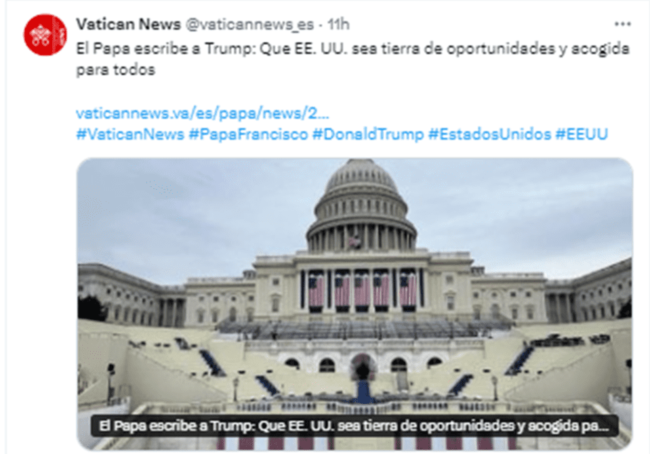 El papa Francisco envió un mensaje a Donald Trump, con motivo de su envestidura como presidente de Estados Unidos, en el que expresó su esperanza de que su gobierno trabaje por una sociedad más justa, libre de odio, discriminación y exclusión. En su comunicado, el pontífice destacó la importancia de la unidad y el respeto…