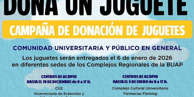 Este año, nuevamente la BUAP convoca a la comunidad universitaria y al público en general a participar en la campaña “Dona un Juguete”, la cual tiene como fin ayudar en su labor a los Reyes Magos y brindar este 6 de enero de 2026 alegría a niños y niñas de municipios y localidades marginadas del estado de Puebla.