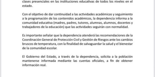Autoridades educativas exhortaron a madres y padres de familia, así como a directivos y docentes, a mantenerse atentos a los canales oficiales de comunicación para cualquier aviso adicional y reiteraron el compromiso de garantizar condiciones seguras para la comunidad escolar.